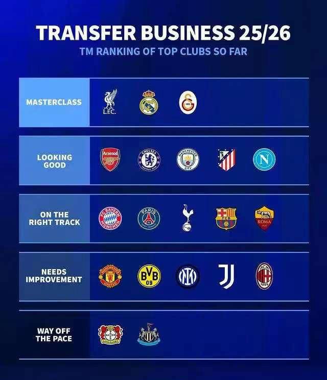 评级为“需要改进”的球队包括曼联、多特蒙德、国际米兰、尤文图斯和AC米兰,这些球队的转会都存在一些问题,但夏季转会窗口还未关闭,他们仍有时间解决困境。而被评为“走在正轨上”的球队有拜仁慕尼黑、巴黎圣日耳曼、热刺、巴塞罗那和罗马,除罗马外,其他球队的阵容结构基本稳定,有望通过部分补强保持竞争力。